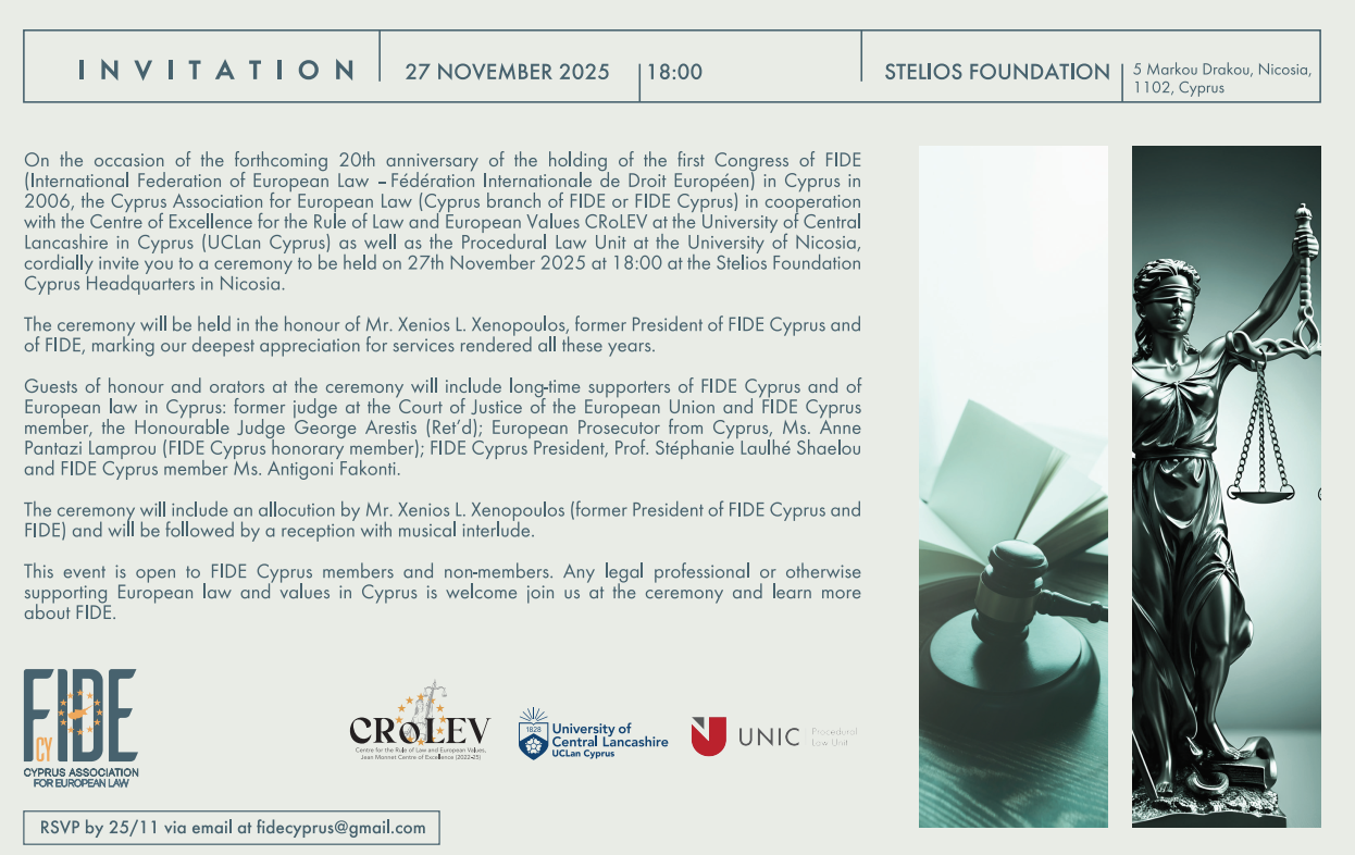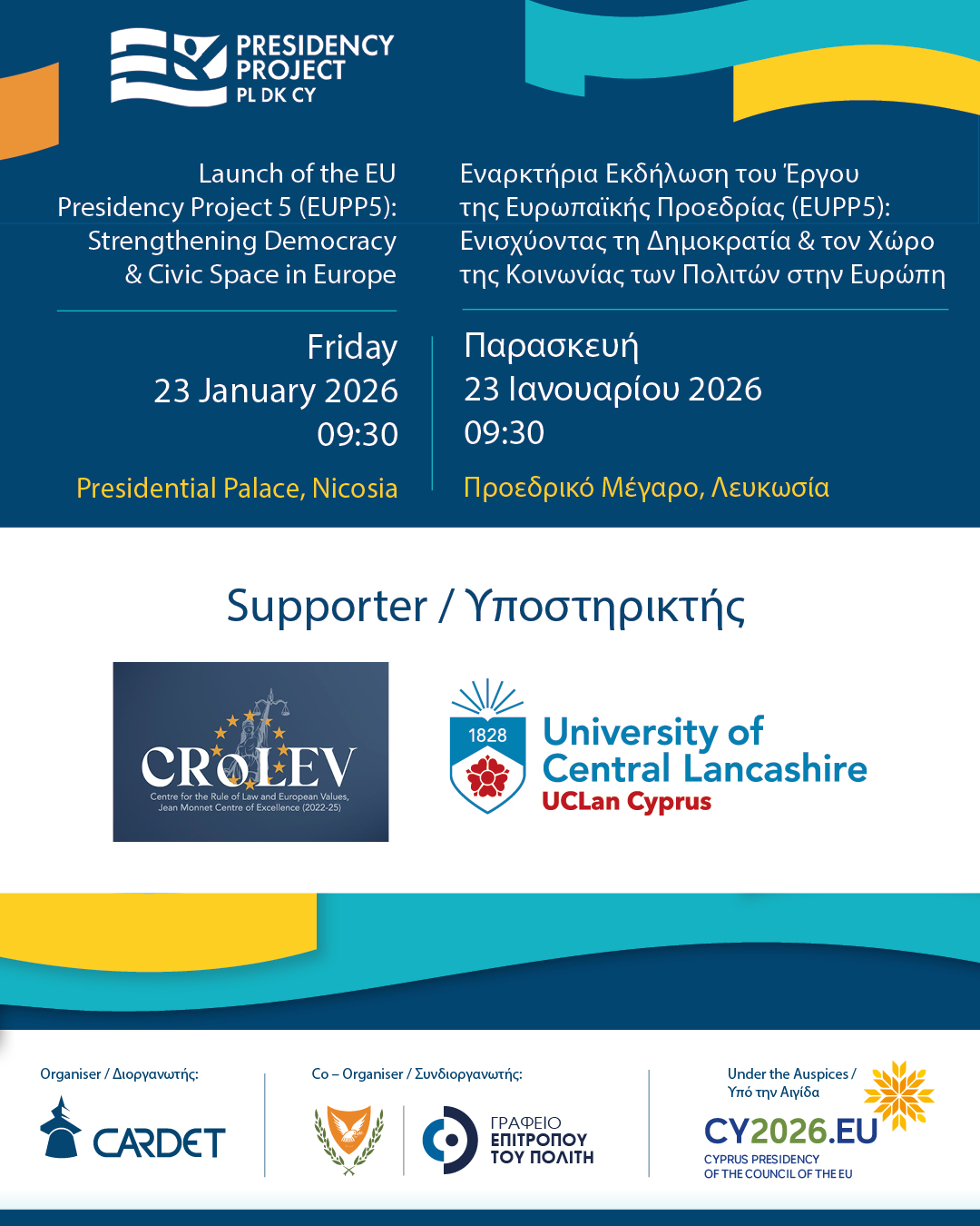 CRoLEV is a Centre of Excellence investigating the rule of law, and EU values and principles in turbulent times. It seeks to strengthen European studies in the region and disseminate research on the rule of law and European values in Cyprus, neighbouring countries and Europe, building bridges between the EU and its neighbours.
