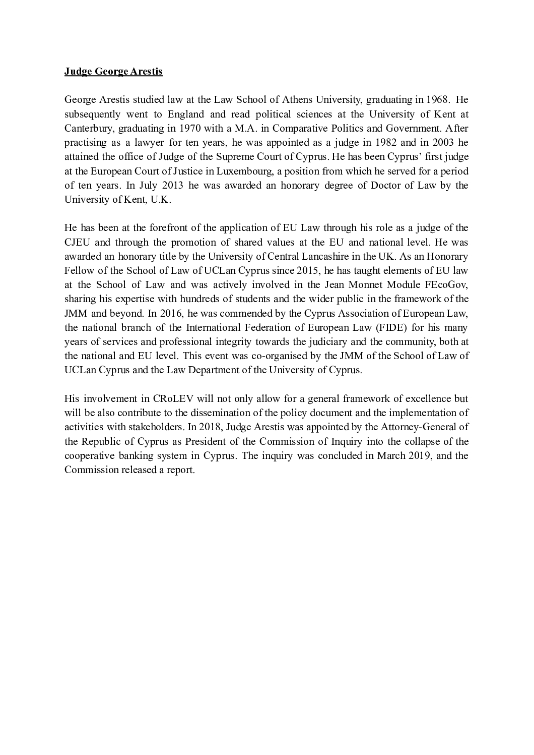 Former Judge at the Court of Justice of the European Union and Honorary Fellow, School of Law, UCLan Cyprus.